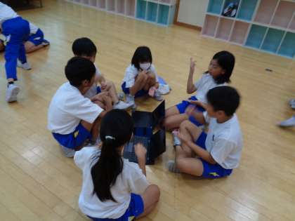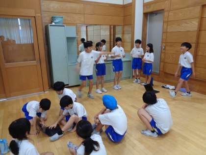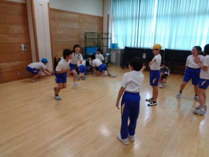 歌に合わせてリズム運動をしています。各団ごとにテーマを決めて、自分たちで動きを話し合いました。チームの個性がでています。