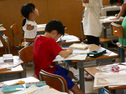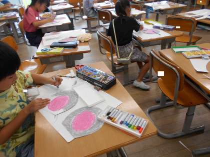 劇に使うお面づくりに励んでいます。練習にも熱が入りそうです。
