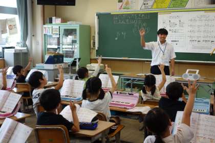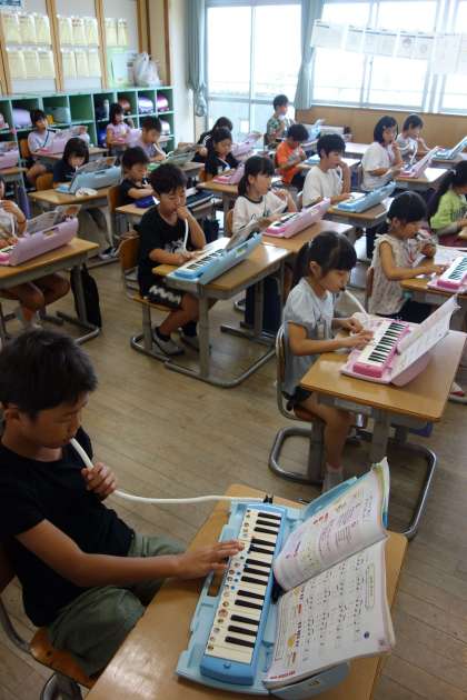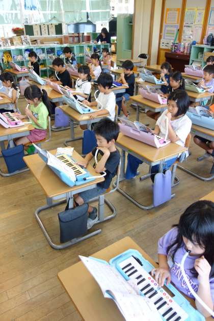 鍵盤ハーモニカを使った音楽科の学習の様子です。教育実習生の先生に教えてもらいながら、正しい運指で演奏できるように練習を重ねました。