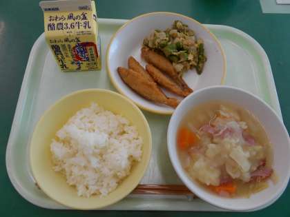 メニューは、ご飯、わかさぎのフリッター、グリーンアスパラガスのごまだれ、野菜のスープ煮、牛乳でした。さくさくのフリッターと白菜が入ったサラダ、そしてベーコンの香り豊かなスープ。全てがおいしくてご飯が進みます。食欲の秋です。