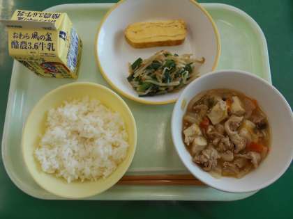 メニューは、ご飯、厚焼き卵、香味和え、肉豆腐、牛乳でした。今日の肉豆腐には、豆腐がふんだんに使われています。他にも、豚肉、野菜、きのこ等、具材がたくさん入っており、栄養満点です。美味しくいただきました。