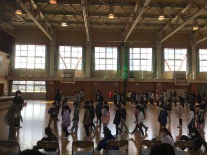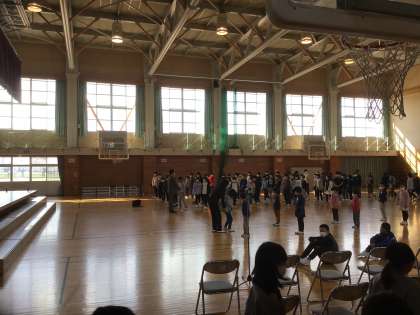 始業式を始める前の整列の様子です。初日から全校が並ぶために基準列としてお手本になって整列しています。