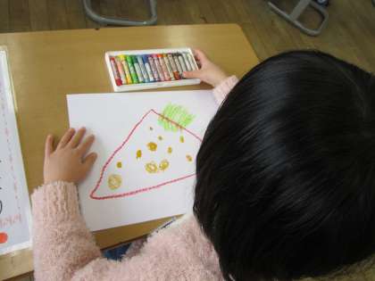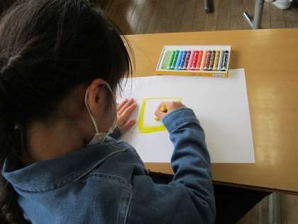 このしゃしんは、せんしゅうの きんようびの ずこうの じかんの ようすです。じぶんのすきなものについて、がようしいっぱいに、いっしょうけんめい かいていましたね。いっしょうけんめい がんばるすがたが、とても りっぱでした。