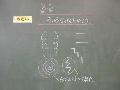 書写で、いろいろなせんをかいてみましたか。せんせいもあらたなせんを見つけました。