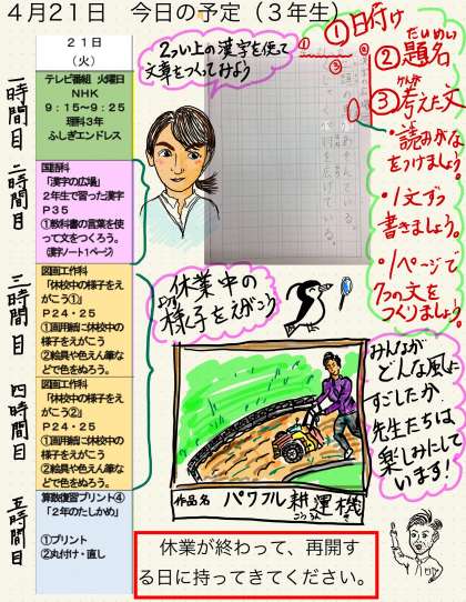 休校(休校)がのびたので、作品の提出は休校が終わり、学校に登校する日でよいです。
