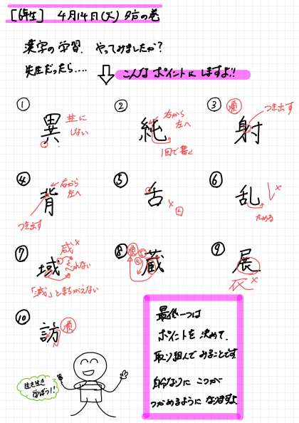 漢字の学習をするときは、今までの経験を生かし、どこに気をつけたらよいか考えることができれば、これからの漢字の学習は何の心配もありません。もう1年間かけて、新しい字をどうやって学べばよいか考えていきましょう。