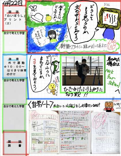 今日は自分で学習を考える時間が多くあります。この時間では、3年生のふく習や4年生の学習のよ習などを行いましょう。今日は3年生のときすばらしいかった自学ノートを写真でのせました。いろんな人の自学の仕方を取り入れて自分の力を高める力を伸ばしていきましょう。