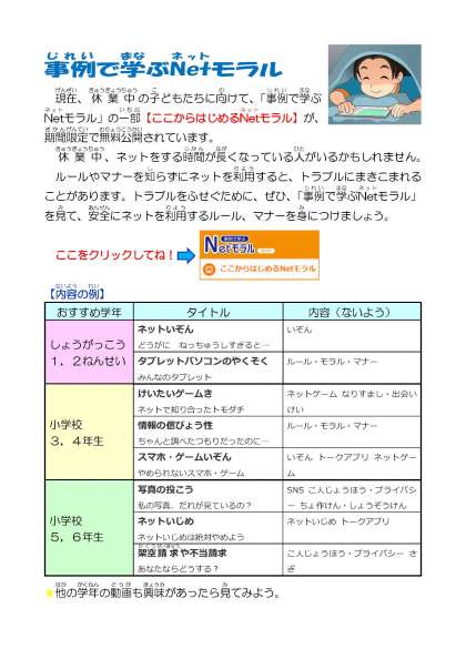 市内小中学校で導入されている「事例で学ぶNetモラル」の一部【ここからはじめるNetモラル】が、休業中の期間限定で、無料公開されています。