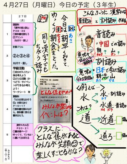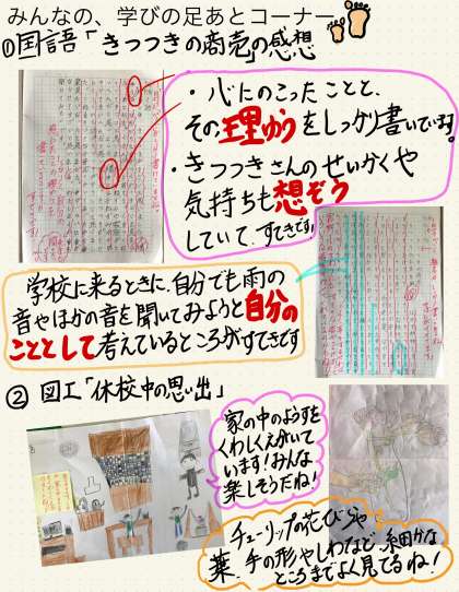 今日は、学習予定に加えて先週みなさんから集めたノートや絵を少し紹介(しょうかい)します。友達のよいところを取り入れながら、自分の力をみがいてくださいね。