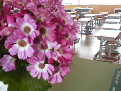 きょうしつのなかのはるは、まだまだげんき。うつくしいはなをさかせて、いつかくる1ねんせいたちをまっています。