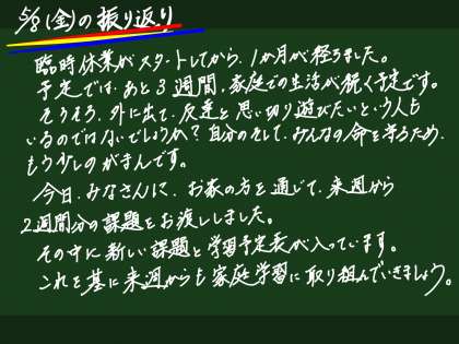 今日で臨時休業4週目が終わります。週末も、体調に気を付けて生活してくださいね!