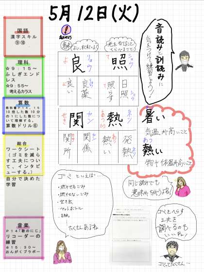 みなさん、おはようございます。昨日から気温が上がり、暑さを感じるようになってきましたね。今日は、3時間目の算数で、新しい学習がありますね。さんこうにできるプリントを入れておいたので、それを見ながら学習してみてください。また、6時間目は終わっていますが、15時半から「おんがくブラボー」という音楽科のテレビが入ります。楽しく学べる内容なので、ぜひ見てください。