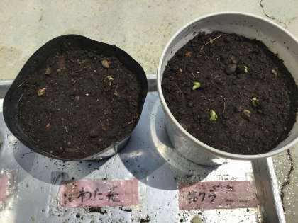 おやっ!!「わた花」と「オクラ」から芽が出てました。