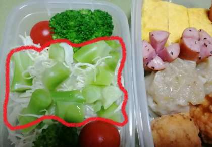 昨日の総合の課題「食品ロスについてのインタビュー」では、おうちの人からどんなことが聞けましたか?先生も、食ざいをむだにしないよう、毎日れいぞうこの中をかくにんしています。野さいも、食べれるところは全部食べるようにしています。しなっとしてしまった野さいもチャーハンやスープに、キャベツのしんはお好みやきに…。いろいろ工夫しています。今日のべんとうのおかずには、ブロッコリーのくきの部分もサラダに使いました。みなさんの家の工夫も、学校が始まったら聞かせてくださいね。