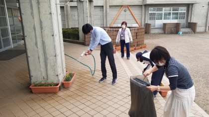 児童玄関前の花壇や、プランターに全部で160本ほど植えました。