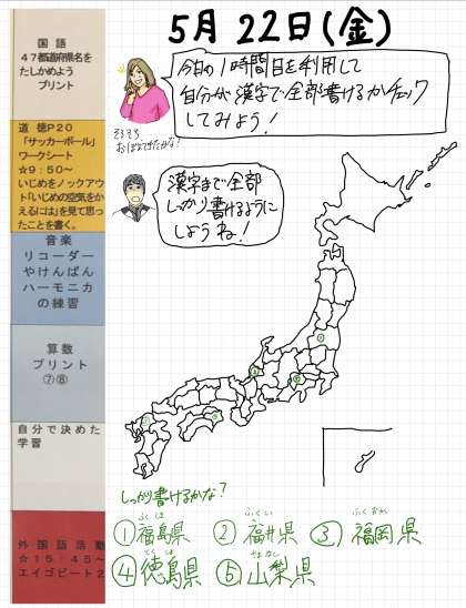 今日も1日家庭学習を計画通り進めていきましょう。都道府県もすべて漢字で書けるようになったかな?漢字までしっかり覚えましょうね。