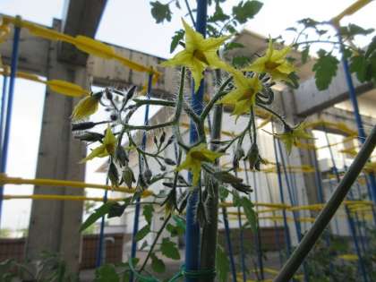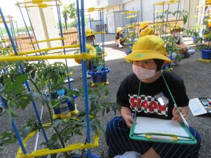 学校での初めての観察をしました。じっくりよく見ながら観察している子供たちでした。小さな実もつき始めている苗もあり、「実ができている!」と大喜びの子供たちでした。