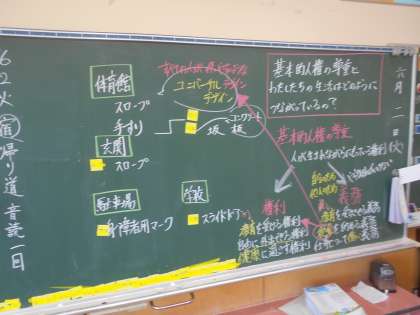 体育館のスロープ、手すり等、学校の施設にも日本国憲法「基本的人権の尊重」との結びつきがあります。今日は、「基本的人権の尊重」と生活とのつながりについて考えました。