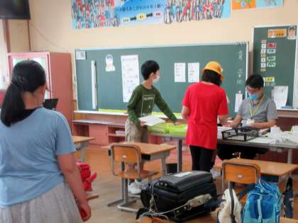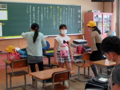 6年生教室では、登校して手洗いを終えた子供が、担任の先生に、検温カードを提出しています。