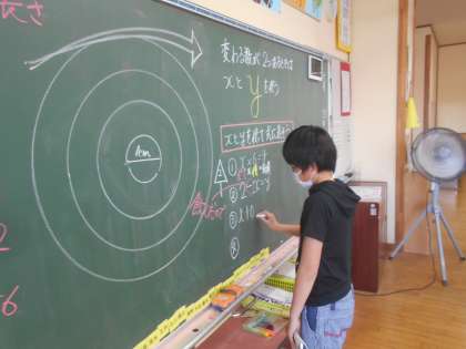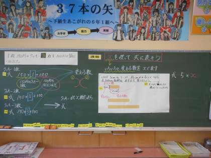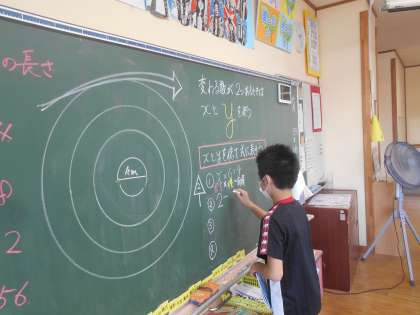 線対称と点対称の学習を終え、次の学習をスタートさせました。今まで、変わる数は□で表していましたが、これからは、エックスとワイで表現します。