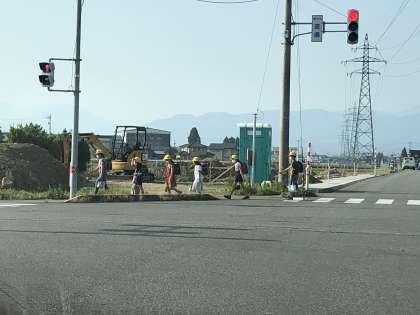 集団登校でも、各班長が意識して間隔を開けて登校しています。