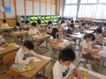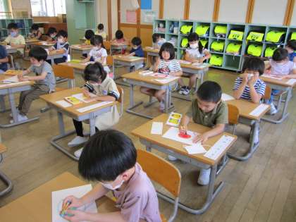 図工「おひさまにこにこ」の学習では、クレヨンを使って、画用紙におひさまを描きました。描く前に、他の作品や先生が描いたおひさまを見て、イメージを膨らませた子供たち。色や形などに工夫をしながら、生き生きとした様子でおひさまを描いていました。