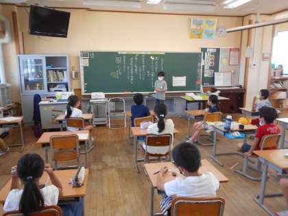 子供たちは、間違いを見つけ、正しい字を黒板に画き、間違った部分を正しい書き方をみんなに伝えています。