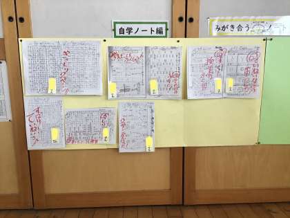 3年教室には、各教科のノートや自主学習ノートを掲示するスペースがあります。