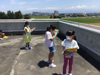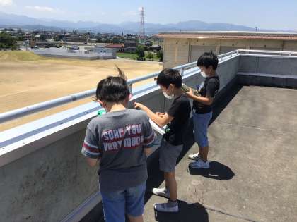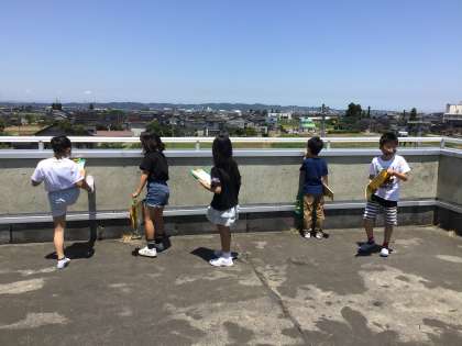今日は、屋上に出て東西南北にどのような建物や地形が見えるか調べました。