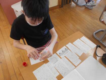 国語科「時計の時間と心の時間」を読んでいます。段落ごとにまとまった文を並び替えながら、筆者の考えの伝え方や考えを読み取り、自分の考えをもちたいと考えています。
