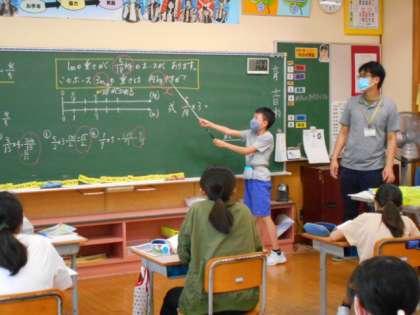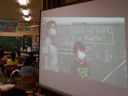 分数×整数の学習では、今日は約分に気を付けることが課題です。出てきた答えがそのままでよいのか、また計算の途中でもっと簡単な数字にかえることができないのか、操作を通じて考えていきます。