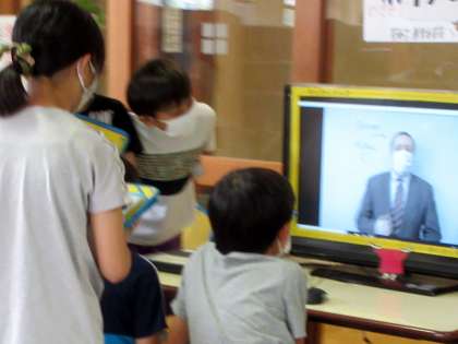 今日放映中のALT紹介ビデオで先生からのメッセージを確認しています。