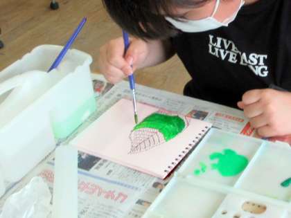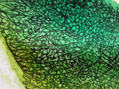 先週描いた葉っぱの形に淡く水彩で色をつけていきます。