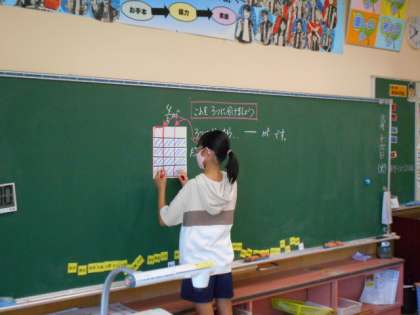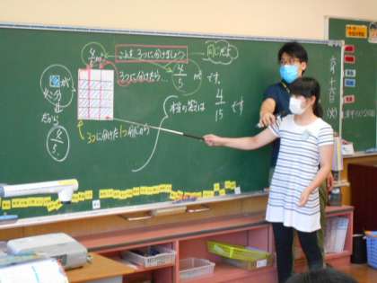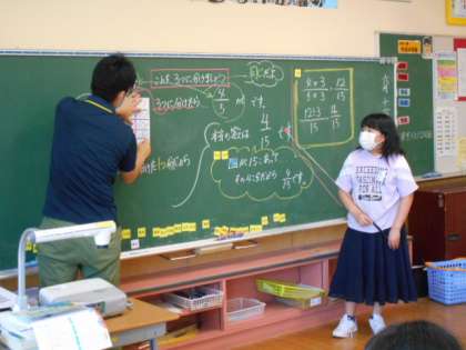 子供たちは、分数カードに補助線を引いたり、求める部分に色を塗ったりしながら、自分なりの方法で解決に向かおうとしています。既習内容を活用し、根拠を基に筋道立てて考え、自分の言葉で表していきます。なかなか難しく、かつ思考を要する課題ですが、子供たちは真剣に考えていました。