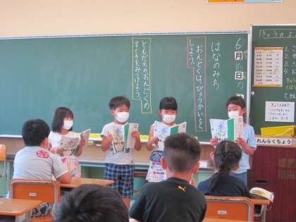 1年生の国語では、「はなのみち」の学習をしています。今日は、グループごとに音読発表会を行いました。1年生にとって、初めての音読発表会。全体の前で1人ずつ音読するのはなかなか緊張したかと思いますが、全員がしっかりと音読することができました。また、発表後は、仲間の頑張りや良さを進んで見つけて、伝えようとする素敵な姿が見られました。