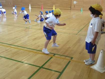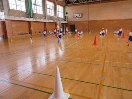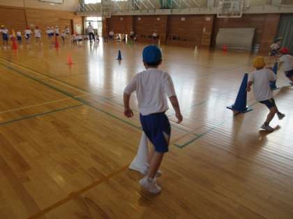 カラーコーンの間を、ジグザグで走りました。タッチはできないので、、、線を足で踏む足タッチで行いました。