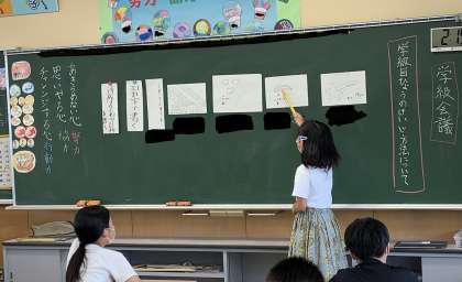 学級目標が決まり、自分たちでどのように掲げていきたいか掲示方法を話し合っています。「クラスの目標だから全員で作るのがいい!」「より意識できるような掲示はどれだろうか…」と活発な意見が飛び交いました。