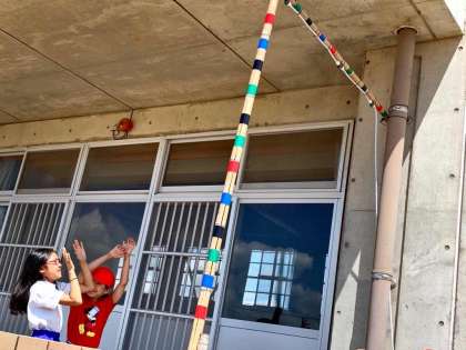 今日はケンステップを使ってリレーを行いました。いっぱい走って疲れた後は、ミストシャワーで涼みました。