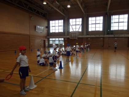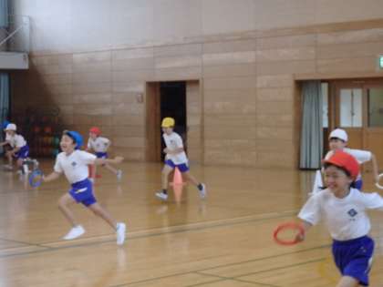 バトンを使ってリレーをしました。みんな一生懸命です。