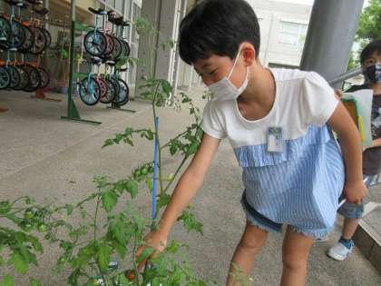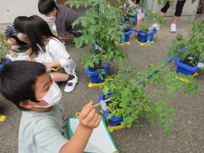 国語科「かんさつ名人になろう」の単元で、観察カードに書くときに大切なことを学習しました。形や色、さわりごこちなど様々な視点で育てているミニトマトを観察しました。