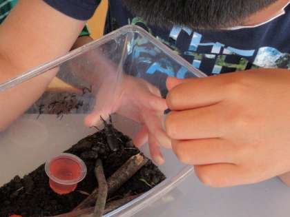 今朝登校中に見せてくれたクワガタが教室に。 カミキリムシもいました。