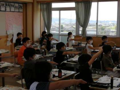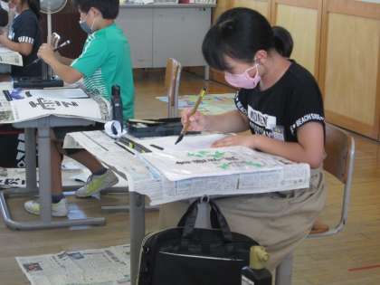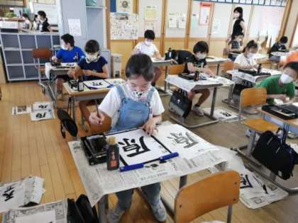 書写の時間。「原」という文字の組み立てを考えながら、美しく書くポイントをしっかり聞いて、集中して仕上げました。教室内に掲示しますので、学習参観の際に、ぜひご覧ください。