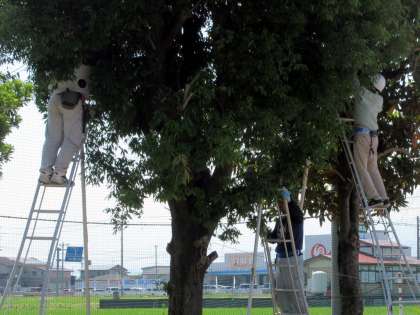近くの学校の用務員さんが協力してグラウンドの樹木の剪定作業
