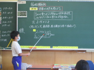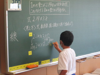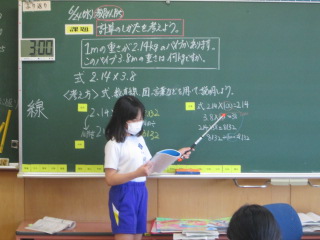 小数×小数の計算を仕方を考えました。かけられる数もかける数も、両方とも整数に直して計算することで、答えを求められることに気付いた子供たち。この考え方が、小数×小数の筆算の考え方につながります。