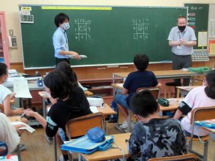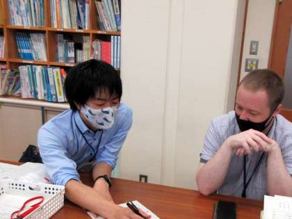 専科の先生とALTが授業前に 英語で打ち合わせ。