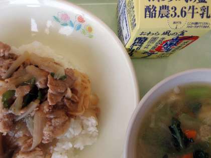 豚肉にはたんぱく質が多く、体をつくる赤のグループの食品です。たんぱく質の他にはビタミンB1が多く、体の疲れを取り除く働きがあります。給食では、カレーや豚汁、ポークチャップなど様々な献立に使っています。今日の焼肉には玉ねぎやたけのこを加え、にんにく、しょうが、白ごま、ごま油など、香り豊かな食材を使って 炒めました。