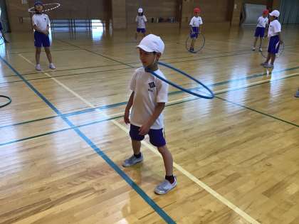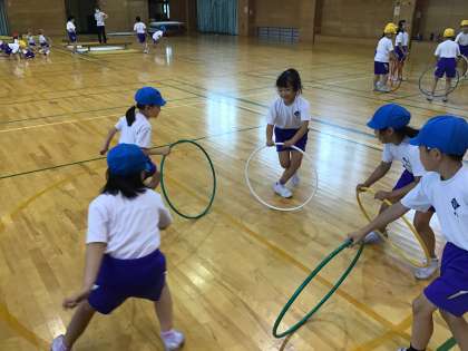 フラフープを、体のいろいろな部分で回したり、投げたり、転がしたり、友達へパスしたりしました。簡単な作りの道具ですが、子供たちは夢中になっていました。
