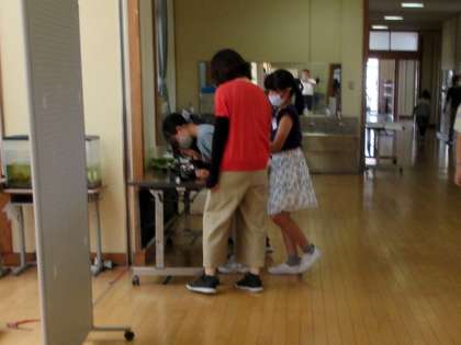 休み時間に解剖顕微鏡でメダカのタマゴを観察する子供たち。