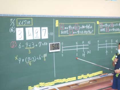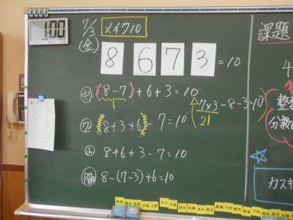 4つの数字で10をつくるメイク10を再開しました。( )を使った式を使った児童の発表の後には、歓声があがりました。
