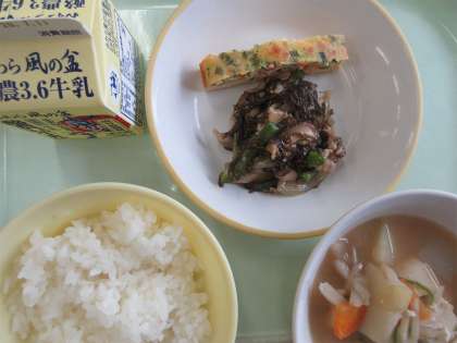 今日のチャプチェには、豚肉、たまねぎ、ピーマン、干ししいたけのほかに、もずくが入っています。もずくは昆布やわかめと同じ海藻の仲間です。成長期に大切な栄養や、おなかの中をきれいにする食物せんいがたっぷり含まれています。